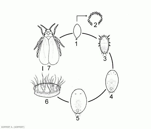 - Estágios de desenvolvimento : os ovos (figura 4-1 e 2) (figuras 5 e 6) são depositados principalmente na parte inferior dos folíolos no ápice. De cor branca, são ovais e têm diâmetro de 0,25 mm. Nos dias seguintes à postura, escurecem. Entre 7 e 10 dias depois, as larvas eclodem (figura 4-3) ( (figuras 7 e 8); estas, ovais e planas, medem 0,3 mm e possuem antenas e pernas bem desenvolvidas. e alimentam-se com o rostro As larvas de segundo ínstar são achatadas, transparentes e têm 0,37 mm de comprimento As larvas de terceiro e quarto ínstares são bastante semelhantes (Figuras 4-4 e 5 ), porém com comprimentos respectivos de 0,51 e 0,73 mm. No último estágio larval, o inseto secreta cera. É quando seus olhos vermelhos aparecem que é chamado de pupário (figura 4-6) (Figura 9). Posteriormente, a mosca-branca cresce e assume uma tonalidade branca. Os adultos (Figura 4-7) ( Figuras 10 e 11) têm 2 pares de asas, cujo tamanho varia consoante o sexo: 1,1 mm para as fêmeas e 0,9 mm para os machos O corpo e as asas estão cobertos por um pó ceroso branco característico Ligeiros critérios morfológicos ics (que podem ser consultados na tabela abaixo) permitem diferenciar os dois insetos. As larvas e os adultos, muitas vezes presentes na face inferior da lâmina foliar, alimentam-se por meio de seu rostro, que funciona como uma bomba de sucção. O excesso de açúcar contido na seiva é rejeitado na forma de melada, principalmente pelas larvas grandes.