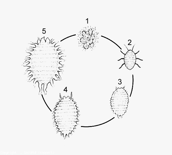P. viburni apresenta vários estágios de desenvolvimento: ovo, 3 estágios larvais e adulto (figura 4).