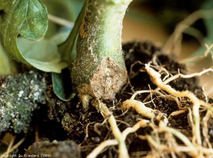 - la subérisation et la nécrose du collet (dont le diamètre est parfois plus important) et du pivot qui subissent des éclatements plus ou moins importants (figure 1). Ces derniers sont en partie dus à la perte d'élasticité des tissus du cortex qui, après subérisation, ont plus de mal à s'ajuster au grossissement de la tige. Notons que ces éclatements permettent parfois à des micro-organismes opportunistes de proliférer et d'entraîner le brunissement des tissus en profondeur et des vaisseaux les plus superficiels. La fragilisation du collet peut en outre entraîner la verse des plantes ;