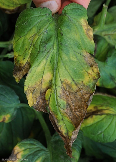 As plantas leve afetadas por Verticillium dahliae frequentemente apresentam murchamento dos folíolos inferiores nas horas mais quentes do dia. Inicialmente, esta murcha é reversível durante a noite. Posteriormente, com o desenvolvimento da doença, pode-se observar que certos setores da lâmina foliar, muitas vezes internervalados e em forma de V, gradualmente amolecem e amarelam (figuras 1 a 3). Porções substanciais dos folíolos eventualmente adquirem uma coloração bronzeada a marrom e então tornam-se necróticas (Figuras 3 a 8). Os folíolos e folhas assim afetados morrem prematuramente, o que pode levar à exposição dos frutos à radiação solar e, portanto, ao risco de queimaduras solares .