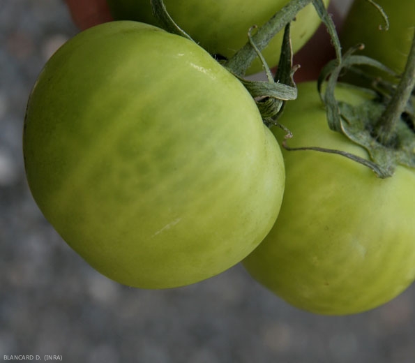 Embora esse sintoma não seja específico do cancro bacteriano, os vasos dos frutos podem ser visíveis, de cor branca; dão assim ao fruto uma aparência com veios (figura 14).