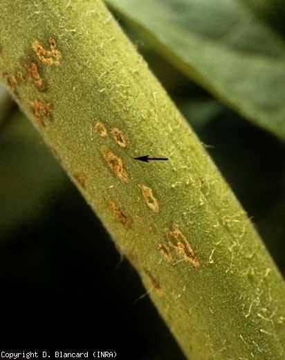 Raras e minúsculas manchas cancerosas , primeiro brancas e depois bege à medida que se suberizam, podem aparecer nos folíolos , nos seus pecíolos , nas hastes (figuras 10 e 11) e nos frutos temporariamente húmidos (figuras 12 e 13). Eles materializam a contaminação aérea local de C. michiganensis subsp. michiganensis . Nos frutos, as manchas têm uma forma muito característica que lembra o olho de um pássaro. Eles são brancos, elevados, alguns milímetros de diâmetro (3 a 4 mm) e têm um centro marrom escuro. Quando eles estão próximos um do outro, eles podem se fundir.