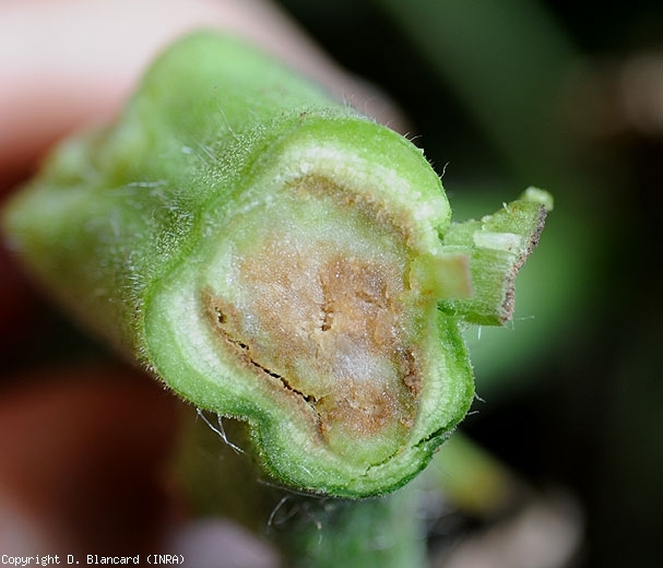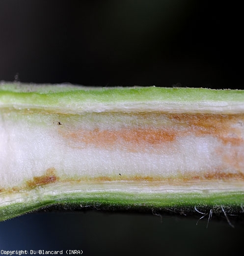 Plantas gravemente afetadas produzem frutos menores , mal coloridos ou que caem prematuramente. Uma seção transversal mostra vasos vasculares frequentemente descoloridos. Embora a doença possa ocorrer em qualquer momento do ciclo de desenvolvimento do tomateiro, é especialmente quando a planta começa a frutificar que ela se manifesta particularmente. O tempo entre a contaminação e o aparecimento dos primeiros sintomas varia principalmente de acordo com as condições climáticas. Pode ser bastante curto, cerca de 2 a 3 semanas e, por vezes, atingir pelo menos 3 meses. Em muitos casos, várias plantas contíguas na mesma linha são afetadas (figura 9). Esta distribuição em linha resulta da transmissão da bactéria durante as operações de cultivo (poda, derriça, colheita, etc.).