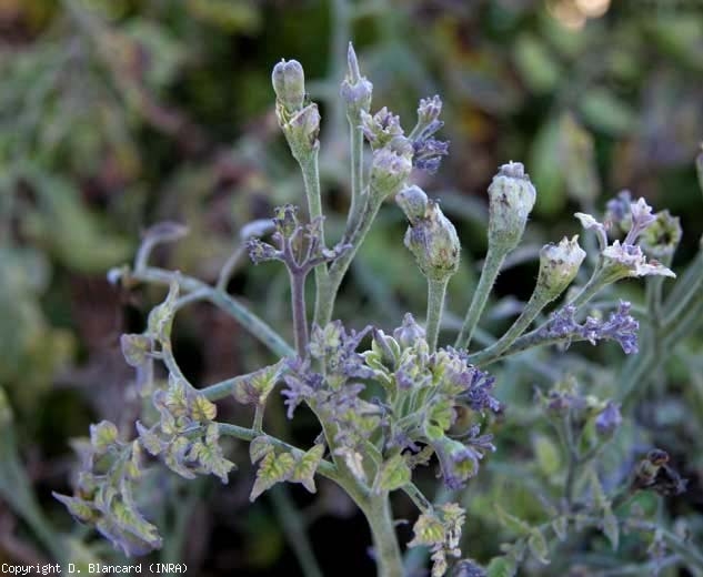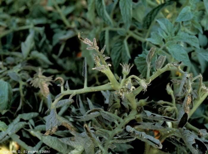 Os fitoplasmas que atacam o tomateiro causam vários sintomas nos órgãos aéreos, jovens e em crescimento, desta beladona. Na França, eles costumam aparecer durante o mês de julho ou mesmo no início de agosto. A partir desse período, o crescimento das plantas afetadas costuma ser atrofiado . Os ápices formam entrenós mais curtos e folhas menores, às vezes enroladas. Os tecidos da lâmina costumam ser mais espessos, até quebradiços (figuras 1 a 3).