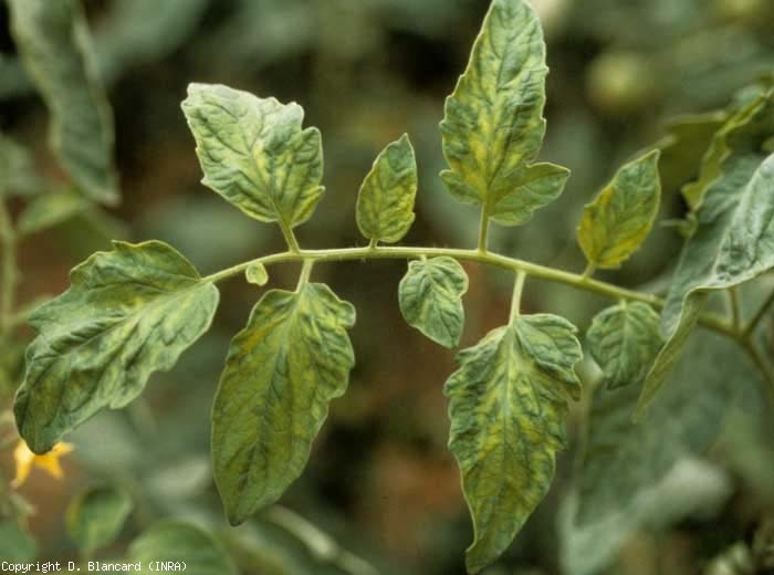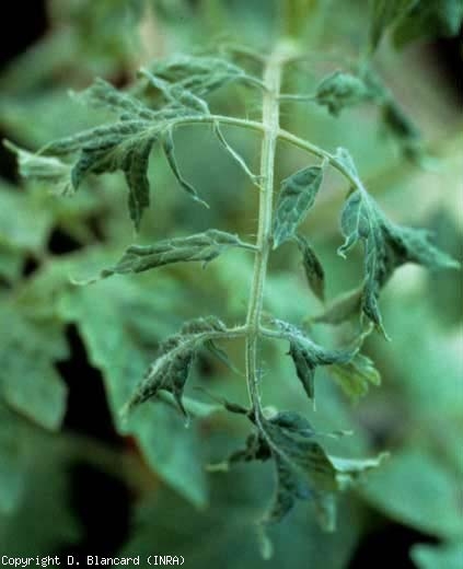 Os sintomas causados pelo vírus do mosaico do tabaco ( Tobacco mosaic virus , TMV) variam de acordo com as cepas. Pode-se observar nos folíolos e nas folhas de manchas claras, um mosaico verde a amarelo (figuras 1 a 3). Em condições de inverno, ocorrem deformações nas folhas. A largura dos folíolos é bastante reduzida, neste caso falaremos de “filiformia” (figuras 4 e 5).