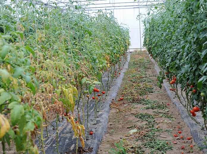 Em muitas situações, os nematóides das galhas não são os únicos bioagressores a atacar o sistema radicular do tomate: eles freqüentemente contribuem para predispor as raízes ao ataque de fungos telúricos, às vezes atuando como um complexo: Thanatephorus cucumeris (Rhizoctonia solani), Colletotrichum coccodes, Pyrenochaeta lycopersici, Sclerotium rolfsii … Assim, a degradação das raízes é mais rápida e os danos são mais substanciais. O Meloidogyne spp. também interagem com alguns patógenos vasculares do tomate, como Ralstonia solanacearum, Fusarium oxysporum f. sp. lycopersici e Verticillium dahliae , aumentando sua incidência e severidade. Cabe agora integrar estes bioagressores telúricos, a bactéria Rhizobium radiobacter , que afectam em conjunto o sistema radicular do tomateiro, amplificando os sintomas de galhas e deformações radiculares (figuras 4, 7 e 10).