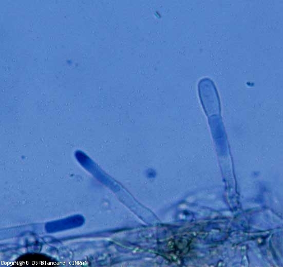 Nos poucos dias seguintes às contaminações, pequenos conidióforos nascem nas hifas secundárias formadas na superfície da lâmina e produzem os conídios (figura 2). A esporulação é muito abundante (figuras 3 e 4). Os conídios (figura 5) são bastante frágeis e vivem apenas algumas horas ou mesmo alguns dias quando as condições lhes são favoráveis. São muito leves e por isso são facilmente transportados e disseminados pelo vento , e secundariamente pela chuva ou salpicos durante a rega por aspersão.