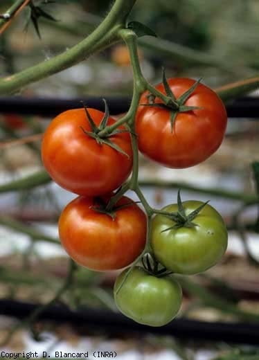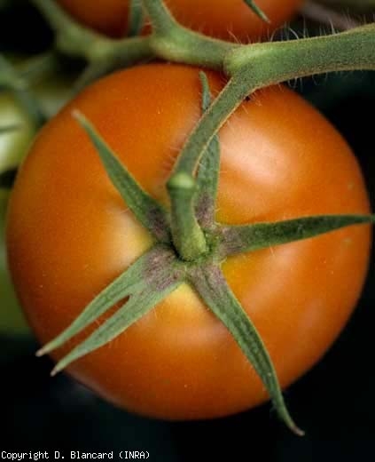 As sépalas às vezes são superficialmente necróticas (Figura 6), e as flores podem ficar marrons e abortar . Os frutos apresentam um mosaico mais ou menos intenso , sobretudo quando maduros (figuras 7 e 8). Esse mosaico pode ocorrer sem que outros sintomas estejam presentes nas plantas.