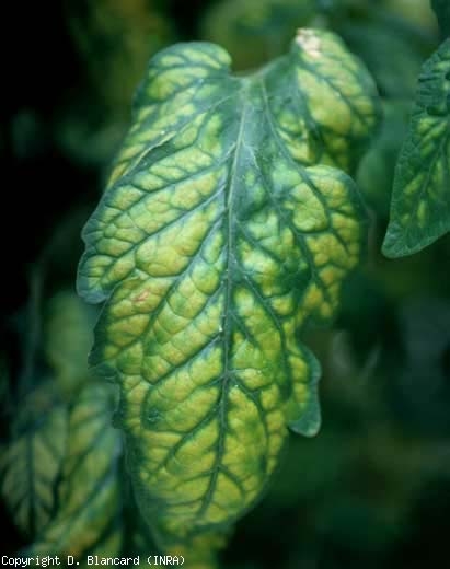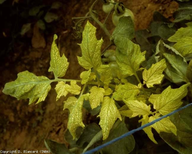 Os sintomas de deficiência aparecem primeiro nos folíolos jovens e depois podem generalizar-se a toda a folhagem do tomateiro