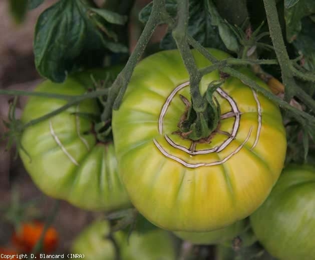 Fissuras, rebentando mais ou menos profundas e extensas, ocorrendo preferencialmente nas zonas pedunculares e por vezes estilares dos frutos ( fissuras de crescimento ). Estas ranhuras podem ser longitudinais, radiais ( fissuras radiais , figuras 1 a 3) e até concêntricas ( fissuras concêntricas ) (figura 4). Quanto mais cedo eles ocorrem, mais prejudiciais eles são.