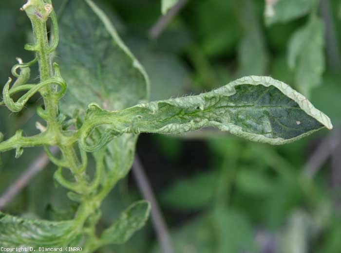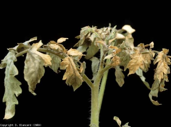 murcha e , ressecamento necrose foliar . Assim, os folíolos dos tomateiros afetados podem apresentar:- áreas internervais lívidas nas folhas inferiores, espalhando-se, tornando-se necróticas e gradualmente secando;- necrose e ressecamento da periferia da lâmina de folhas novas e velhas;- murcha e secagem das folhas no ápice….