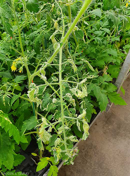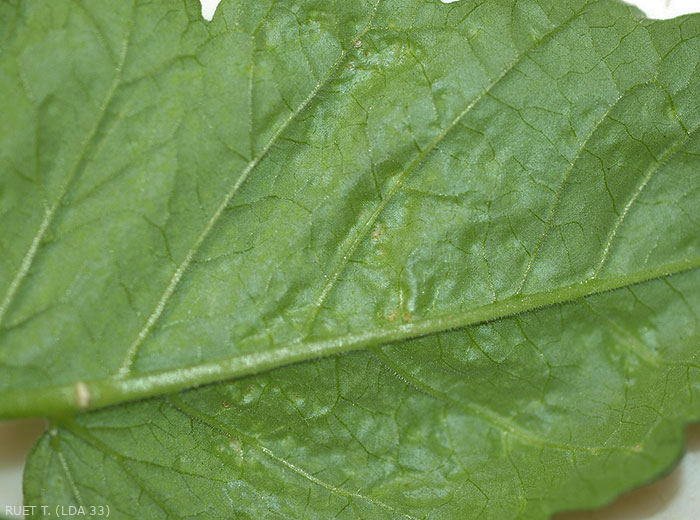 Manchas cloróticas mais ou menos distribuídas perto das nervuras freqüentemente aparecem nas folhas inferiores (figura 1). Na verdade, essas manchas se formam quando o equilíbrio hídrico entre a absorção radicular e a evapotranspiração nas plantas é perturbado, com as últimas absorvendo mais água do que podem remover em condições de abrigo. Segue-se então uma saturação de água dos tecidos foliares na origem das intumescências. Estas correspondem a ilhas de células, localizadas na parte inferior do limbo, que se “empanturraram” de água, resultando por vezes na ruptura da epiderme. Assim, formam-se edemas de aspecto úmido a oleoso (figuras 2). Posteriormente, as células acabam por estourar e os tecidos suberizantes assumem uma tonalidade acastanhada (Figura 3). Além disso, em condições particularmente húmidas, a presença de numerosas intumescências leva à deformação e enrolamento de numerosos folíolos (figura 4). Saiba também que as intumescências também se podem formar no caule (figura 5), nos pecíolos e nas inflorescências (figura 6).