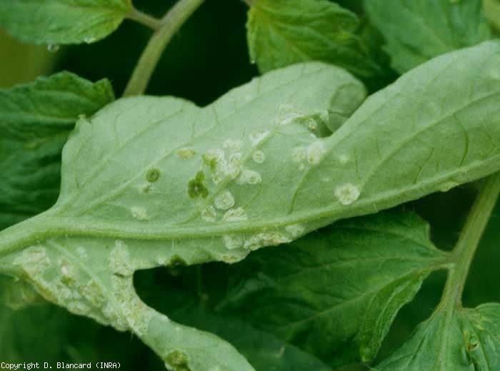 Em determinadas situações agroclimáticas, podem formar-se intumescências na face superior do limbo: notam-se também pequenas bolhas circulares, húmidas, depois cloróticas, eventualmente tornando-se necróticas (figura 7), aspecto rugoso da face superior das folhas, enquanto a parte inferior está ligeiramente inchada (Figura 8).