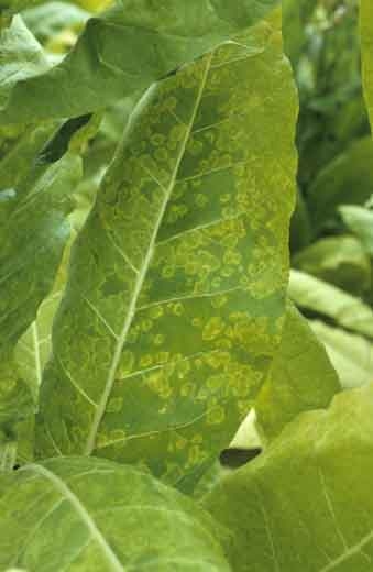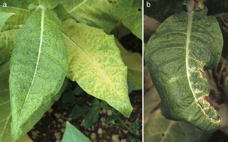 Unlike what the American name of the disease, "vein banding", would suggest, the symptoms caused by potato virus Y (PVY) on different types of tobacco are numerous and variable. One can observe various patterns of discoloration (figures 1 to 5) resulting in more or less pronounced mottling, vein yellowing ("vein clearing") or greener lamina areas along the veins ("vein banding"). One may notice the presence of numerous rings and / or bright yellow spots on the middle leaves of some plants. These symptoms, previously reported by several authors, can be attributed to a particular PVY strain. Necrotic lesions also occur in several forms (figures 6 to 12):