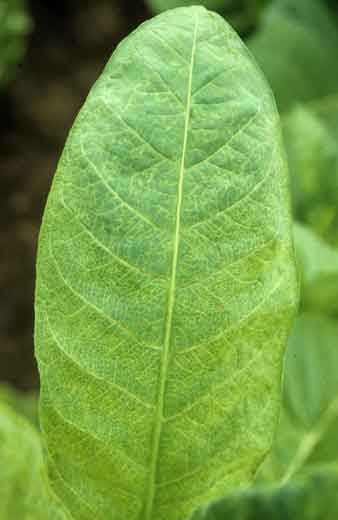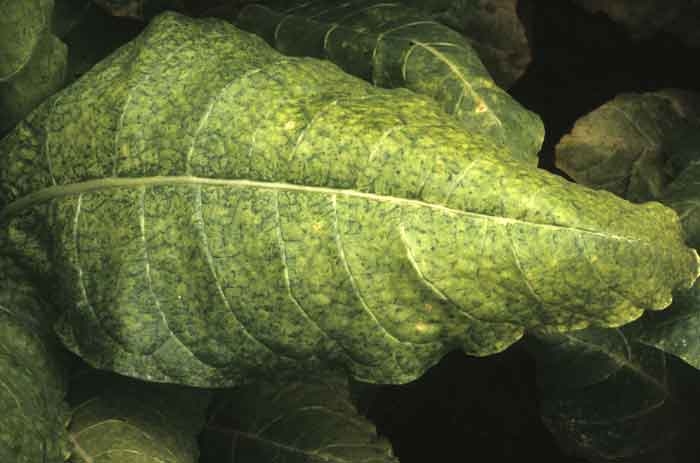 On certain tobacco genotypes, leaf necroses is more superficial and diffuse, giving the lamina a tanned appearance. This symptom is due to mesophyll cell death in the virus infected tobacco leaves that are exposed to sun. It may also be associated with a particular strain of PVY present in mature leaves.
