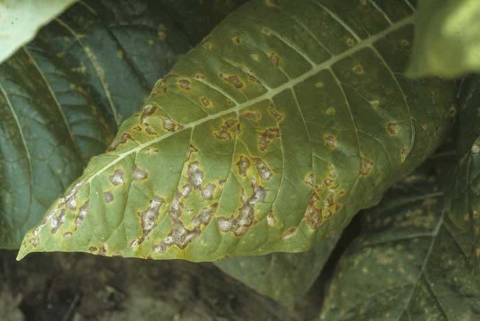 Another Pseudomonas seems to cause similar spots on tobacco in China. In fact Pseudomonas melleum (Johnson) Stapp. has been repeatedly reported in several regions of this country and particularly in Yunnan. The bacterium causes small brown spots surrounded by a yellow halo, both on the lower and intermediate tobacco leaves. It occurs especially after heavy rains and storms, or when plants are subjected to excess or lack of potassium. Control methods to fight it are identical to those recommended to control the two pathovars of Pseudomonas syringae.
