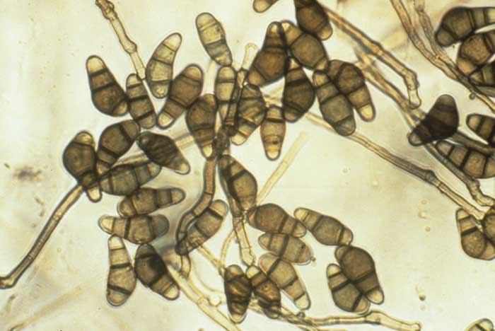 On the spots one can observe branched conidiophores, topped by several multicellular curved, brown conidia, with verrucolose walls (figure 1).