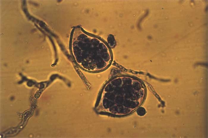 In moist conditions it produces ovoid to spherical (figure 3) sporangia, spherical oospores, and numerous spherical chlamydospores are also observed in damaged tissues.