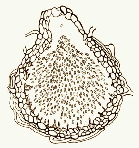 In favourable conditions one can observe with a hand-lens or a microscope conidiophores bearing long, hyaline, pluricellular thick-walled conidia