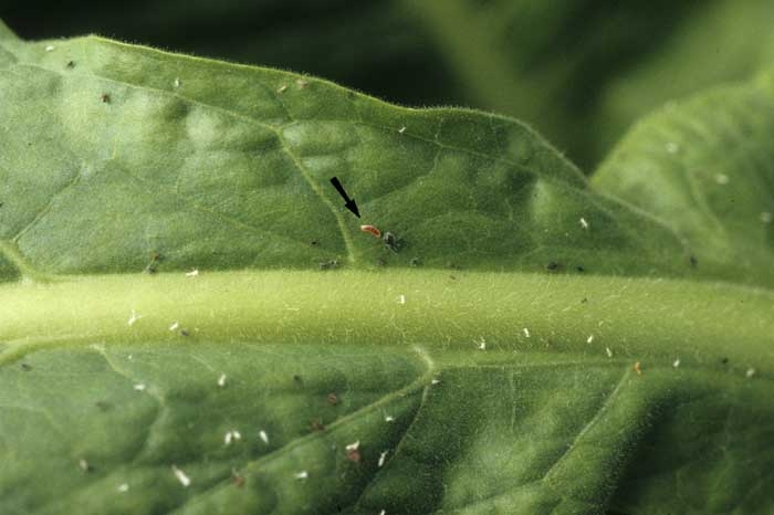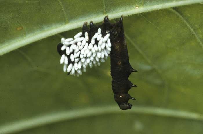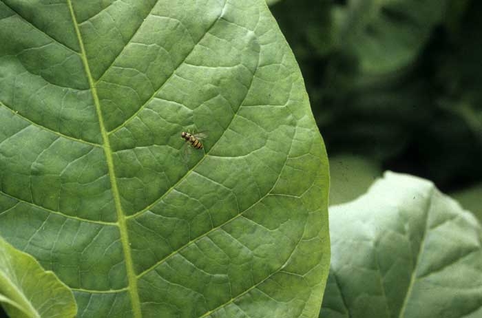 Many natural auxiliary insects (beneficial insects) visit tobacco crops and help to reduce pest populations. Some of them have real specificities, others are much more polyphagous. In France, an exhaustive inventory is in progress to know them better and help to develop their potential parasitism or predation. As we have stated previously, the list of auxiliary species present in tobacco crops is not precisely known. Yet it is quite easy when inspecting a plot to ascertain the presence of the most common and most visible of them. These include for example several species of ladybirds (figure 1), midges (figure 2), hymenoptera parasitoids (figure 3), hoverflies (figure 4), lacewings ... Some of these insects are able to deal with other pests such as whiteflies, thrips, leafhoppers ... The effectiveness of these auxiliaries is still poorly understood. For example, in figure 5 one can observe a defoliating caterpillar parasitised by Apanteles congregatus. The parasitised caterpillar was invaded by several larvae which, at some point spun their white oval cocoons, clearly visible outside it. In the U.S. it is not uncommon to find over 90% of caterpillars parasitised in late season.