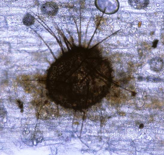 The fungus produces tiny, globular, black structures (pycnidia) (Figure 1) in the epidermal and cortical cells of infected roots. Unicellular and hyaline conidia (figure 2) are released from them including; their role in the epidemic cycle of the disease has not been studied. Note that contaminated plants (especially onion) can ensure the spread of the disease, and infestation of new plots. It is the same for tillage implements moving from one infested plot to another healthy one. Runoffs of water and soil particles also contribute.