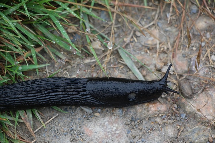 The black slug, Arion hortensis (photos 1 and 2) measures 3 to 4 cm; it is blue- black in colour with an orange yellow ventral face, and the mucus is colourless. The body sides are dark and the tentacles, reddish. It preferably lives deep down in the soil and moves at a rate of 2 to 3 metres during a night. It can lay up to 150 to 300 eggs, mainly between spring and summer. It lives for between 12 and 18 months.