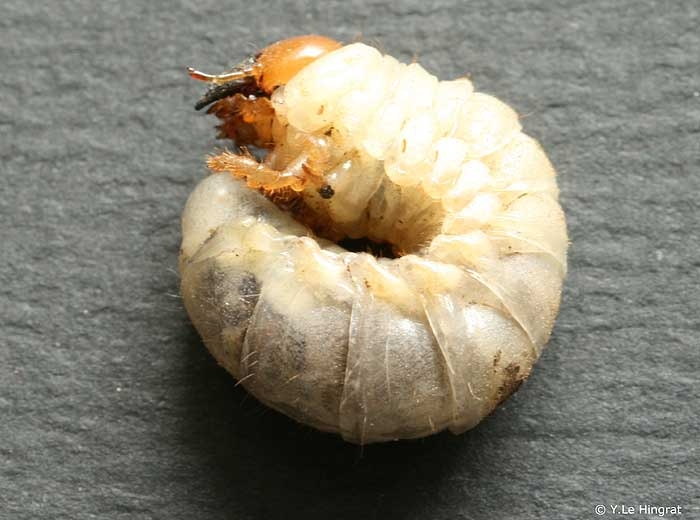 White grubs have a large brown head, bearing strong mandibles; they have 3 pairs of legs situated just below the whitish thorax and a blackish extremity on the abdomen (photo 1).