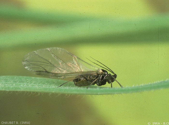 These include the cereal aphids, Rhopalosiphum padi (the cherry-oat aphid - Photo 11), Rhopalosiphum maidis (the green corn aphid), Schizaphis graminum (the small grain aphid), Sitobion avenæ (the grain or brown wheat ear aphid) and aphids colonising other crops, e.g. Brachycaudus helichrysi (the leaf-curling plum aphid - Photo 12), Phorodon humuli (the hops aphid - Photo 13), Cavariella aegopodii (the carrot aphid - Photo 14), Lipaphis erysimi (the turnip aphid) and Myzus certus which are among the most common species in Western Europe.