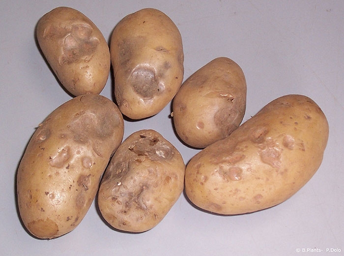 The symptoms appear when the plants are getting warm again after frost. The frozen part of the tuber becomes soft. The inside becomes liquid and blackens. In the case of a partial frost, irregular grey to black spots (photo 3) may be observed in the flesh but more commonly in the outer part of the tuber.