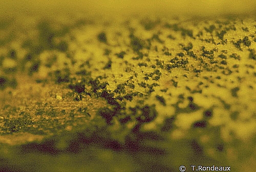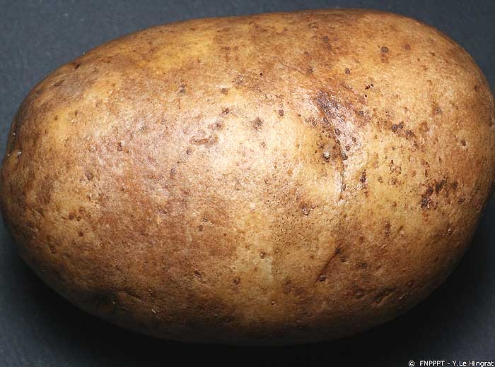 Lesions on tubers caused by fungal infection can be observed (photos 3 and 4): irregular and diffuse light to dark greyish surface areas with or without the formation of fructifications (microsclerotia) with setae when tubers are exposed to moisture (photos 5 and 6). Fructifications due to black dot (microsclerotia) are larger than for silver scurf (conidiophores) (photo 7).