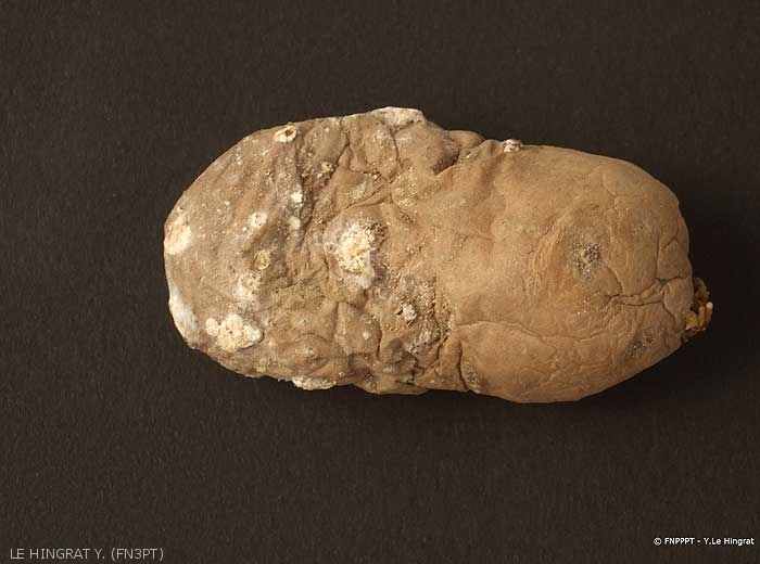 When cut in half, the tuber reveals a brown rot which develops into the flesh, with an unclear limit between healthy and infected areas, and with the potential presence of internal cavities covered with mycelium (photos 3 and 4). The tuber may dry out gradually, eventually becoming hard and mummified.