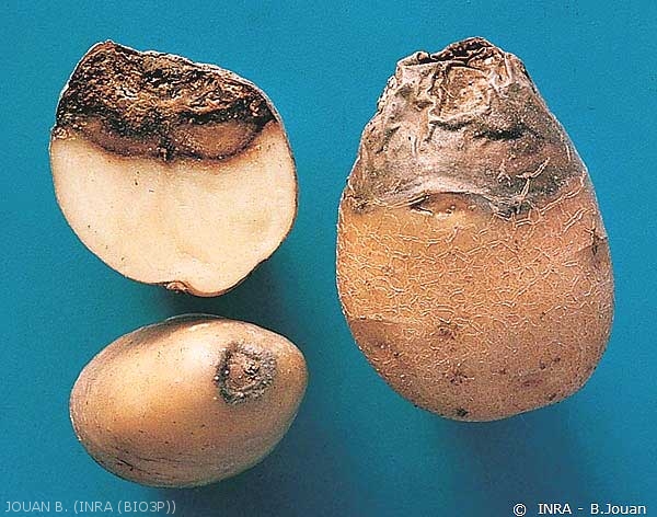 Dark depressed areas may be observed on tubers, characterised by thumb mark spots (photo 1) which are frequently found around the wounds, the eyes, the lenticels or at the heel-end.