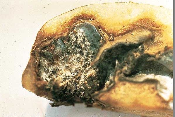 When the tuber is cut across the lesion, the flesh is shown to be infected by a dark-brown dry rot (photo 2), and pycnidia develop in the lining of the cavities (photo 3).