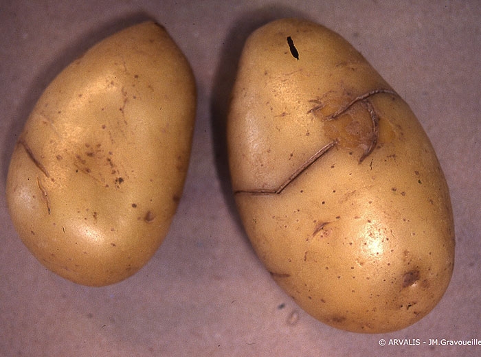 The susceptibility of the cultivar plays an important role in this type of wound. Under the same conditions of production and for the same force of impact, some cultivars burst completely while others only have a few shallow cracks. Apart from this cultivar aspect, a number of other factors can increase the tuber’s intrinsic susceptibility: high turgor pressure due to heavy rain and excessive irrigation, immaturity, premature lifting and low handling temperatures.