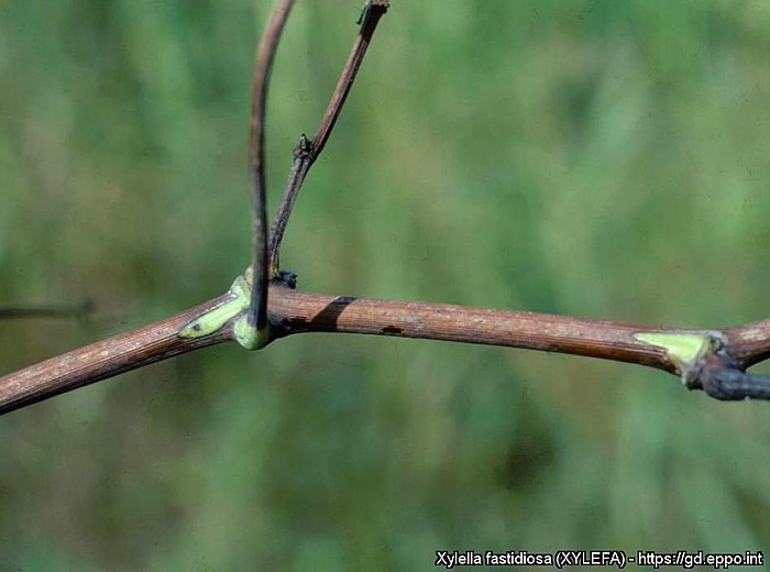 The affected twigs grow irregularly, remaining green in places. In the following seasons, the affected vines bud later and produce chlorotic and stunted shoots. They rarely survive for more than one to two years.