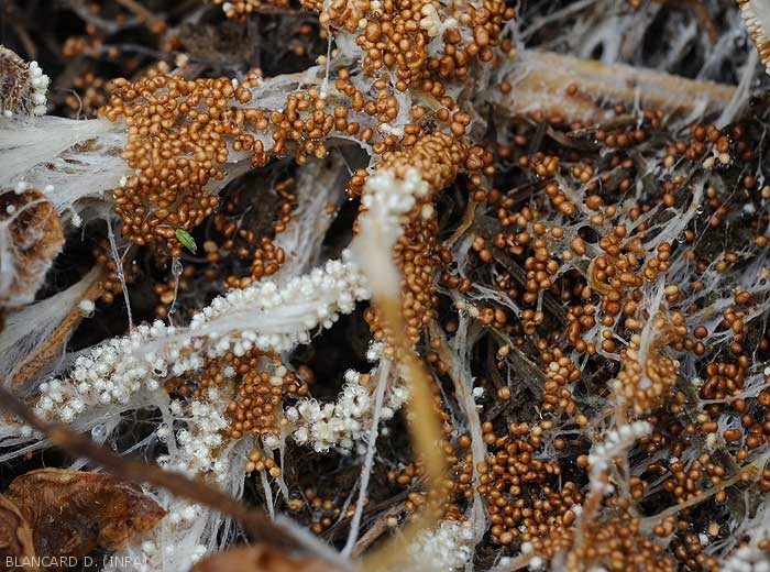 Conservation : persists for several years rather on the surface of the soil on plant debris, in the form of aggregated mycelium ( figures 1 and 2 ), but especially of sclerotia (figures 3 to 6) free or or associated with plant debris. This fungus is also able to survive on different organic substrates.