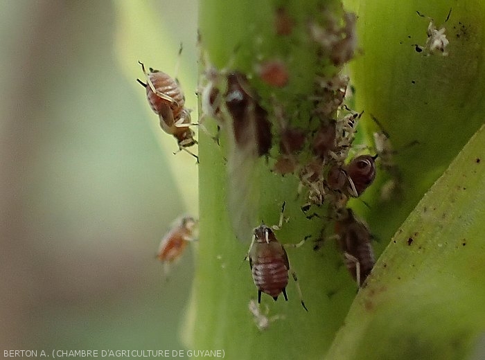 - Larvae and adults often present on the underside of the blade, feeding through their rostrum. The excess sugar contained in the sap is released in the form of honeydew.