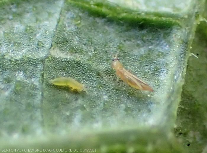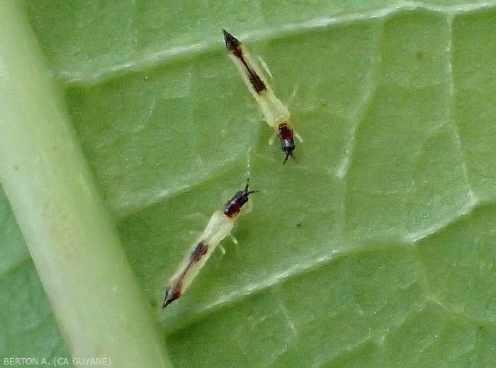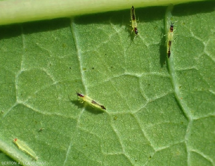 - Signs : Presence of tiny elongated insects on the affected plant organs (figures ).