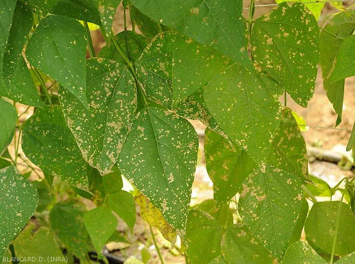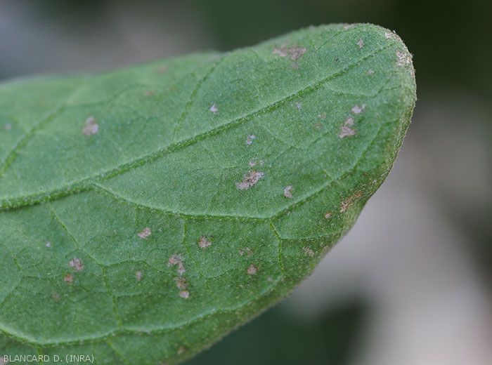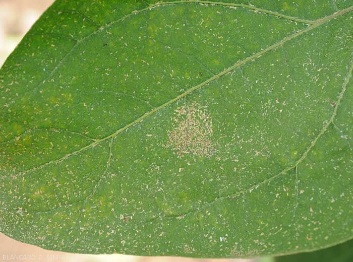 - Numerous and tiny silvery lesions, even patches of irregular size and shape appear on the leaf blade (figure ); they gradually become necrotic and take on a beigeish tint.