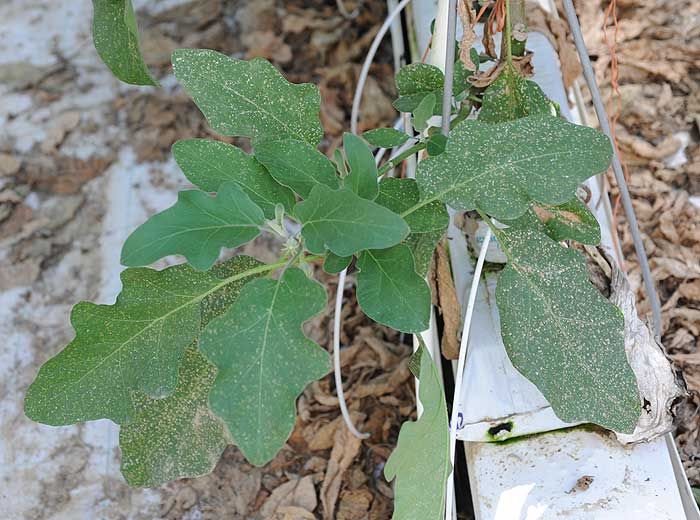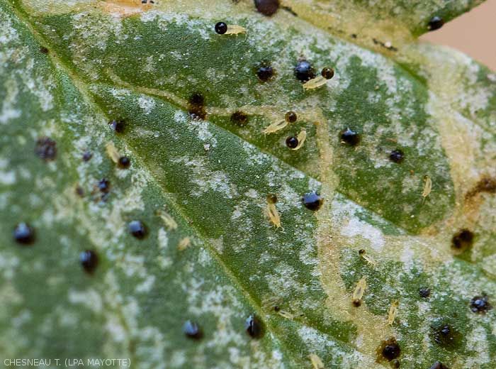 - Presence of tiny black dots materializing the droppings of thrips.