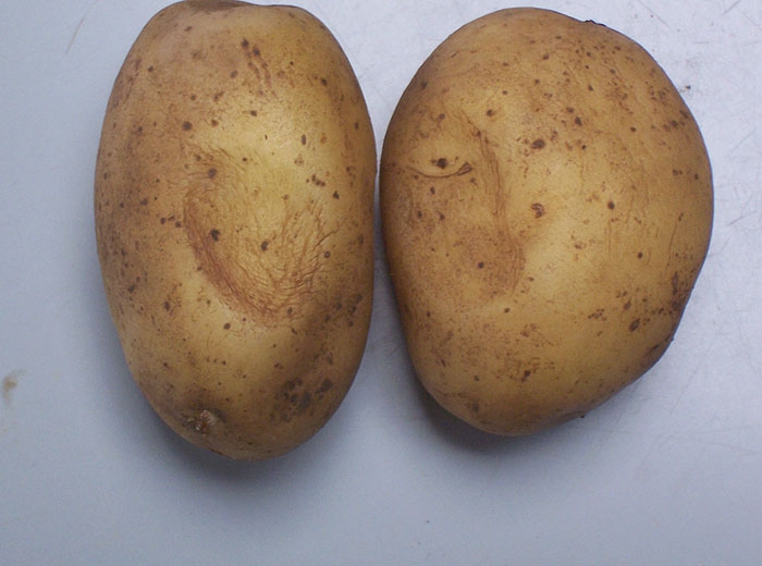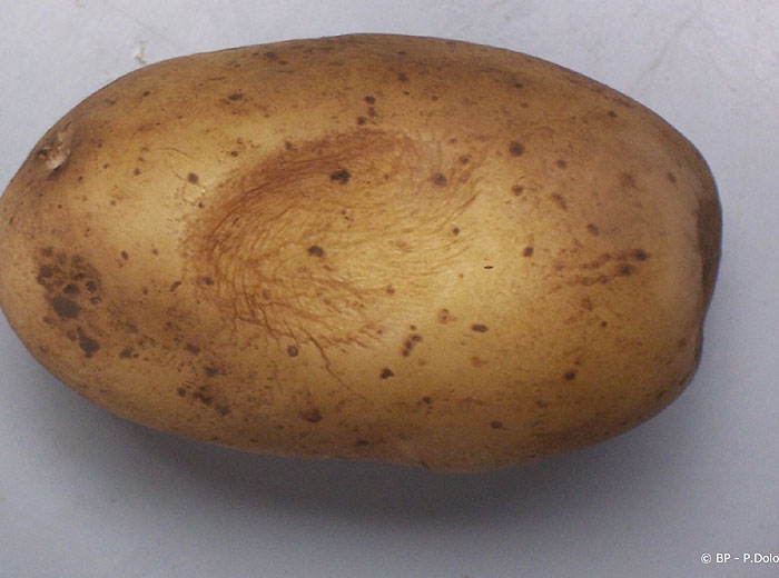 On the surface of the tubers, depressions or flat areas are present, sometimes marked and extensive, and sometimes accompanied by skin wrinkling and a dull appearance (photos 1 to 4). They may be associated with a lesion, which is usually quite superficial and fairly small. In the most serious cases and after a long stay in storage, a symptom of internal blackening may appear in the underlying tissues.