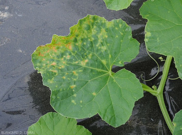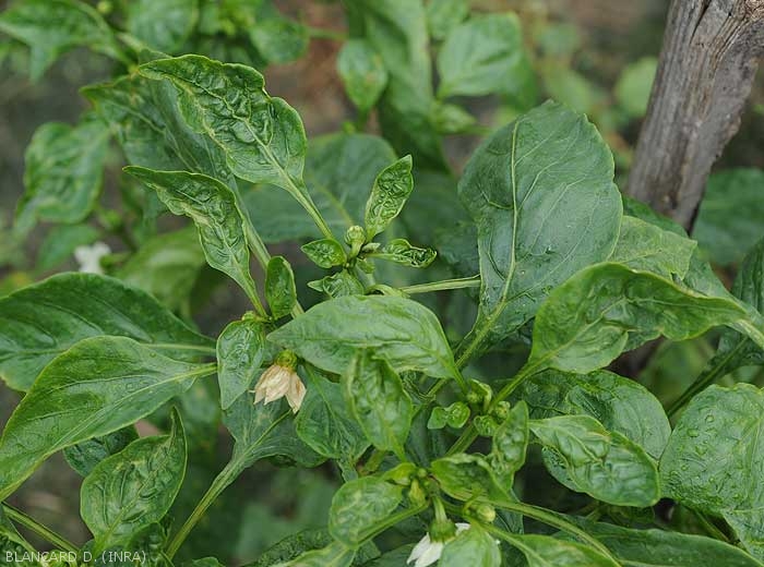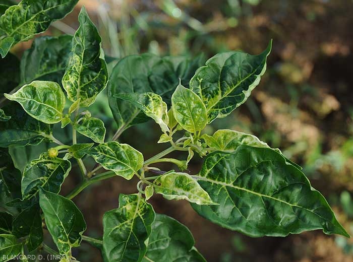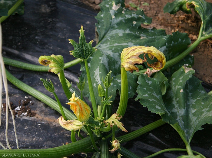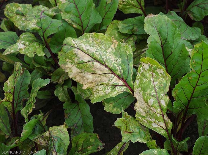 - mottling, leaf yellowing (in spots, veins, on the periphery of the blade, interveinals; whitening; greenish to livid tint, dull and/or bronzed appearance of the leaf blade) (figures 4 to 8); lesions, more or less extensive chlorotic spots, rapidly becoming necrotic (figure 9); wilting and drying out (figures 10 and 11);