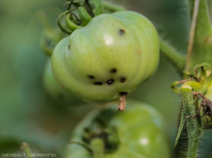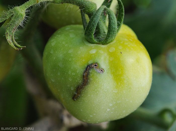 On young tomato fruits, the first attacks appear very early, about ten days after flowering, when their diameter reaches 2 cm. The attack rate then increases rapidly and reaches its maximum about 3 weeks after flowering. Subsequently, older fruits may still be punctured, albeit more weakly.