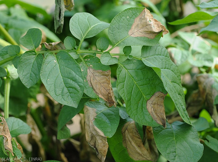 Diseased plants are distributed in clusters in the plots; When the conditions are favourable, the progression of the symptoms on the plants and in the culture is dazzling: leaves, twigs, even plants end up necrosing and drying out completely.