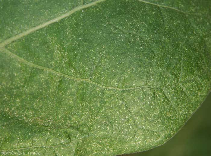 * The larvae, nymphs and adults, often present on the underside of the leaf blade, feed by biting and then sucking the contents of plant cells and are therefore responsible for these symptoms.