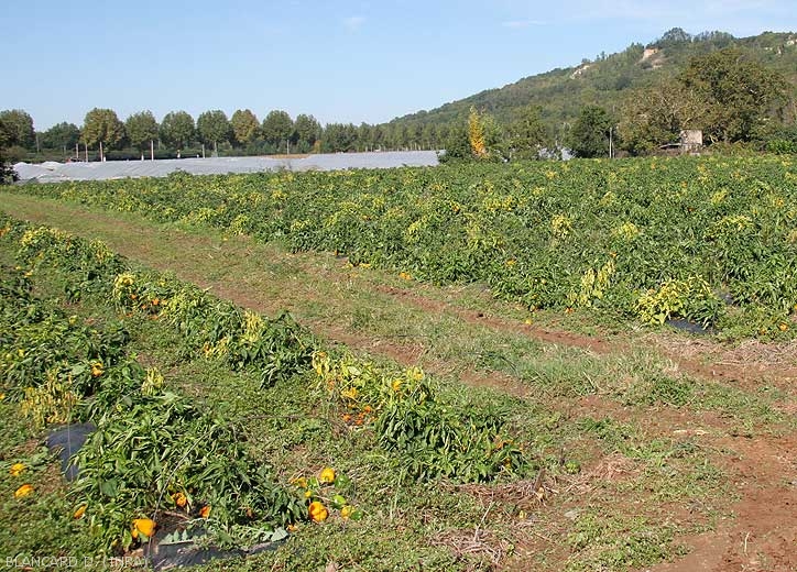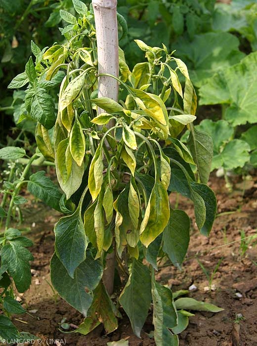 - Yellowing plants, often showing reduced growth, sometimes with shorter internodal apices (figures 1 and 2).