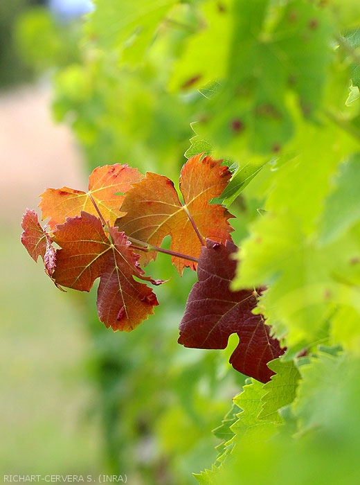 The formation of a black scar bead (figure 1) due to the reaction of the cambium to the oviposition stings results in the "redness" of the end of the branch, because of the disruption of the phloem flow from the leaves to the vine (figures 2 to 7). The leaves can also curl around the edges which, on red grape varieties, recall symptoms of flavescence dorée.