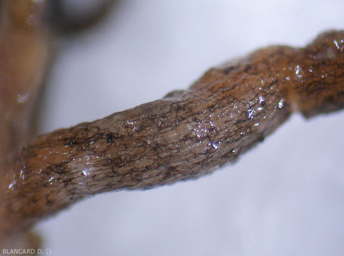Signs : dense brown to black superficial mycelium reminiscent of Rhizoctonia solani ; multitude of black microsclerotia (50 to 200 µm); Globular and black pycnidia (whose diameter can fluctuate between 100 and 250 µm) forming hyaline, ellipsoid to oval conidia, measuring 16-29 x 6-9 µm.