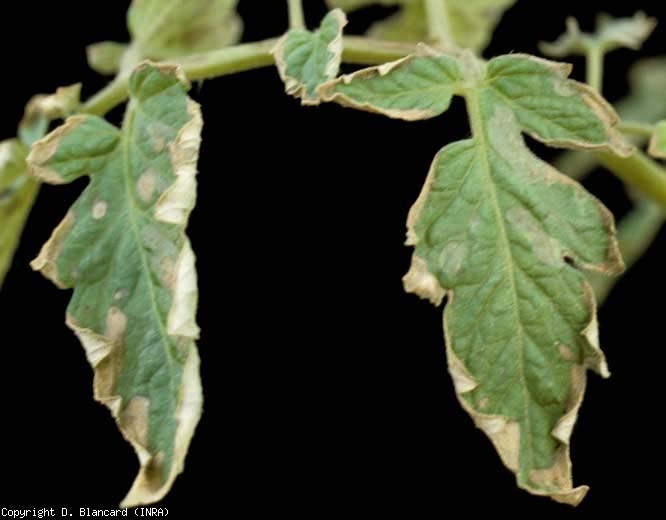 - des plages internervaires livides sur les feuilles basses, s'étendant, se nécrosant et se desséchant progressivement ;