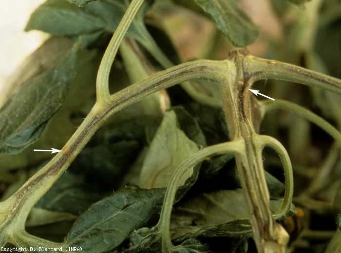Diseased plants see their growth blocked. Young leaves gradually chlorinate and sometimes wilt (Figures 1 and 2). Elongated, brown to black, irregularly shaped lesions are visible on the surface of the stem (Figures 2 and 4), and sometimes petioles (Figure 3). In some situations, bacterial exudates bead up on the surface of the leaflets . It should be noted that some stems become quite brittle. A longitudinal cut in the latter shows that the marrow is affected. This first takes on a translucent appearance and a pale brown tint, then gradually darkens (photo 606) ; it can also hollow out and retract to form several cavities which alternate more or less regularly with parts still intact. The T vascular derived may have a brownish color.